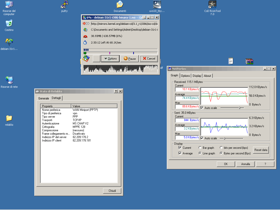 L'upload invece e' ottimo... 28kb/s via ftp (senza VPN arrivavamo massimo a 32kb/s) via p2p sempre i soliti 28kb/s senza problemi e senza "strozzare" il download :)