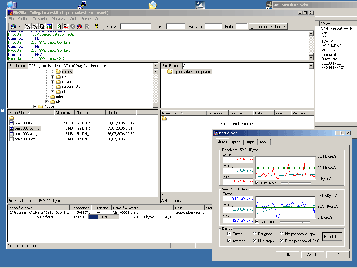 Bittorrent... nello spefico bittornado, qui non si nota alcuna differenza, ne rallentamento rispetto all'uso senza VPN IRC... assolutamente nessun problema nemmeno per ricevere ed inviare files con xchat Ovviamente, vista la tecnologia usata... e visto che qualsiasi pacchetto prima di finire su internet deve andare prima in Svezia le prestazioni per il gaming online non sono ai vertici... questo uno screen preso in un server svedese di Call of duty 2(sullo stesso server uscendo direttamente con la mia connessione pingo in media sui 60ms...)