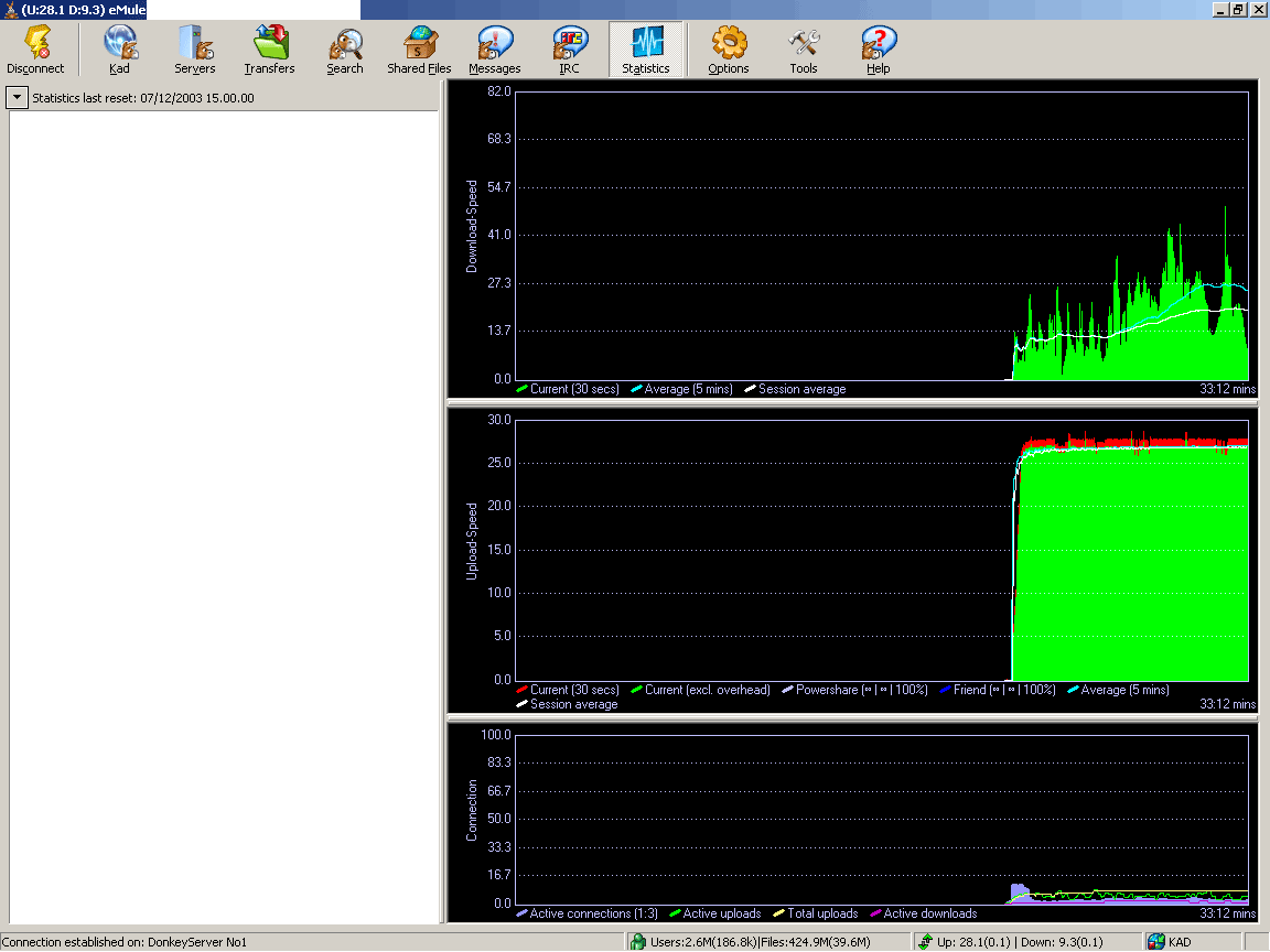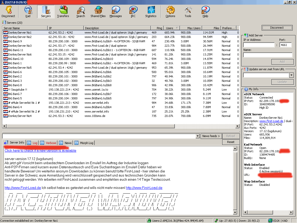 emule appena avviato si connesso immediatamente con ID alto... e iniziato a caricare come al solito fino a raggiungere il limite impostato a 28kb/s, il download invece se le fonti a caricare erano USA faceva un po' fatica a prendere piede... ma di questo ne parliamo dopo