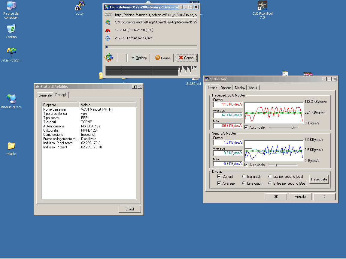 L'upload invece e' ottimo... 28kb/s via ftp (senza VPN arrivavamo massimo a 32kb/s) via p2p sempre i soliti 28kb/s senza problemi e senza "strozzare" il download :)