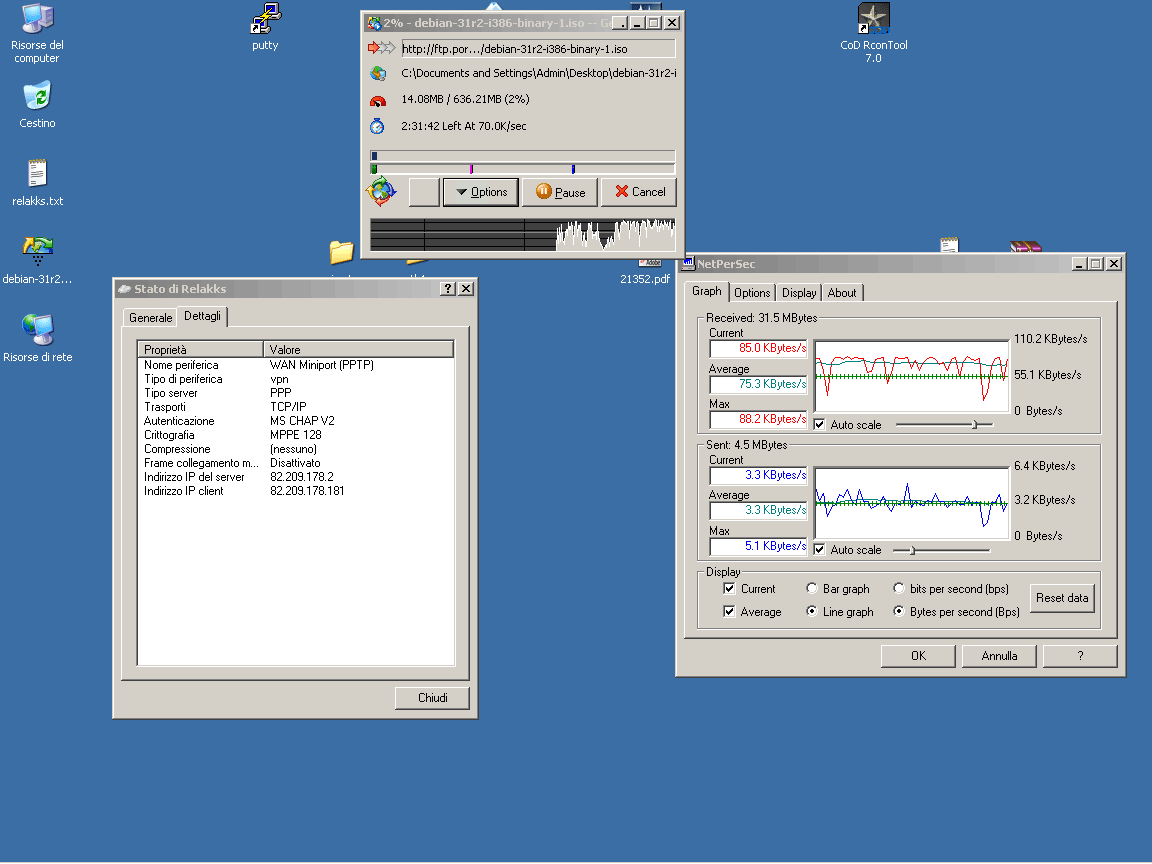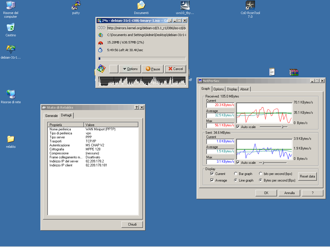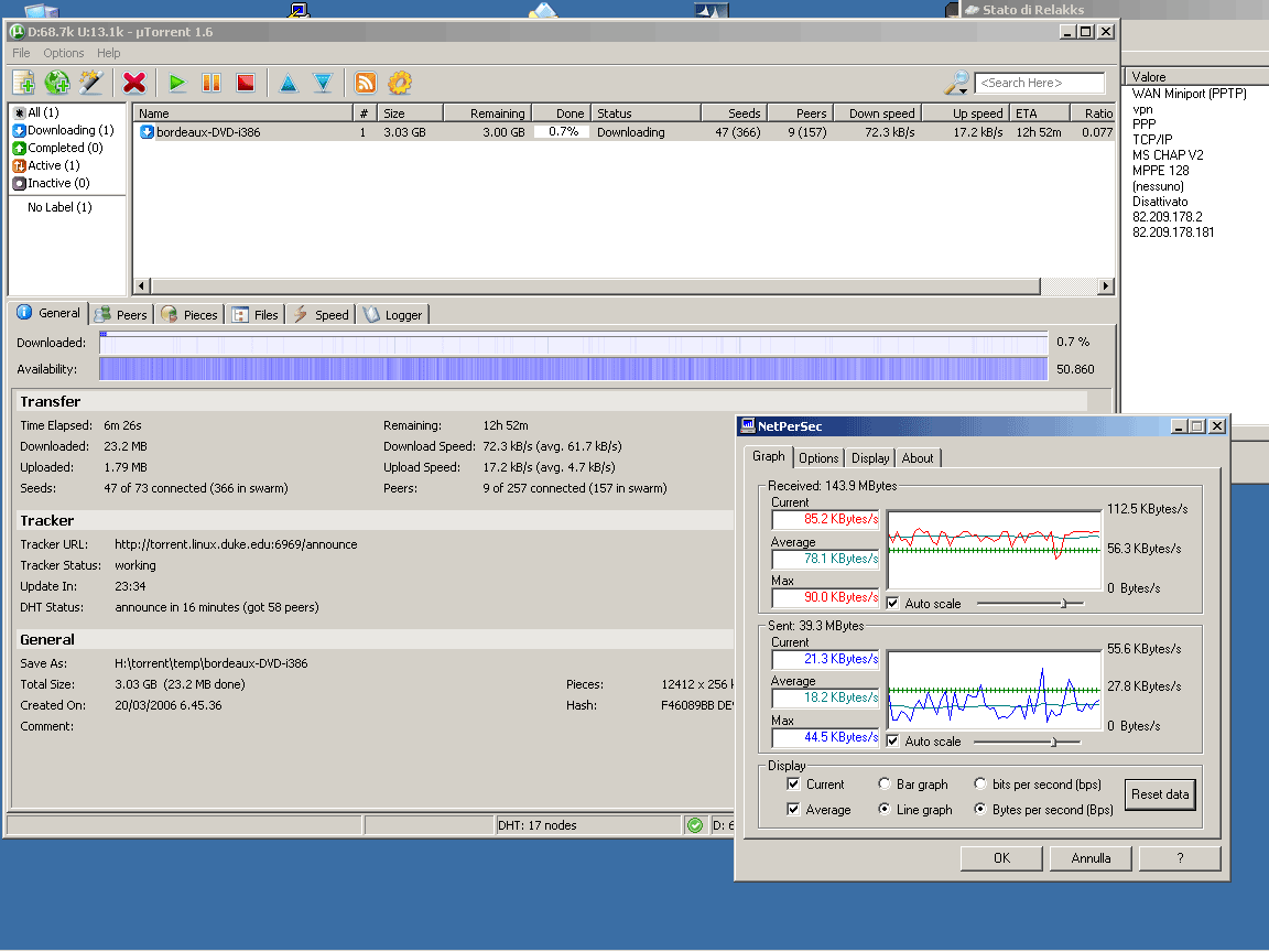 L'upload invece e' ottimo... 28kb/s via ftp (senza VPN arrivavamo massimo a 32kb/s) via p2p sempre i soliti 28kb/s senza problemi e senza "strozzare" il download :)