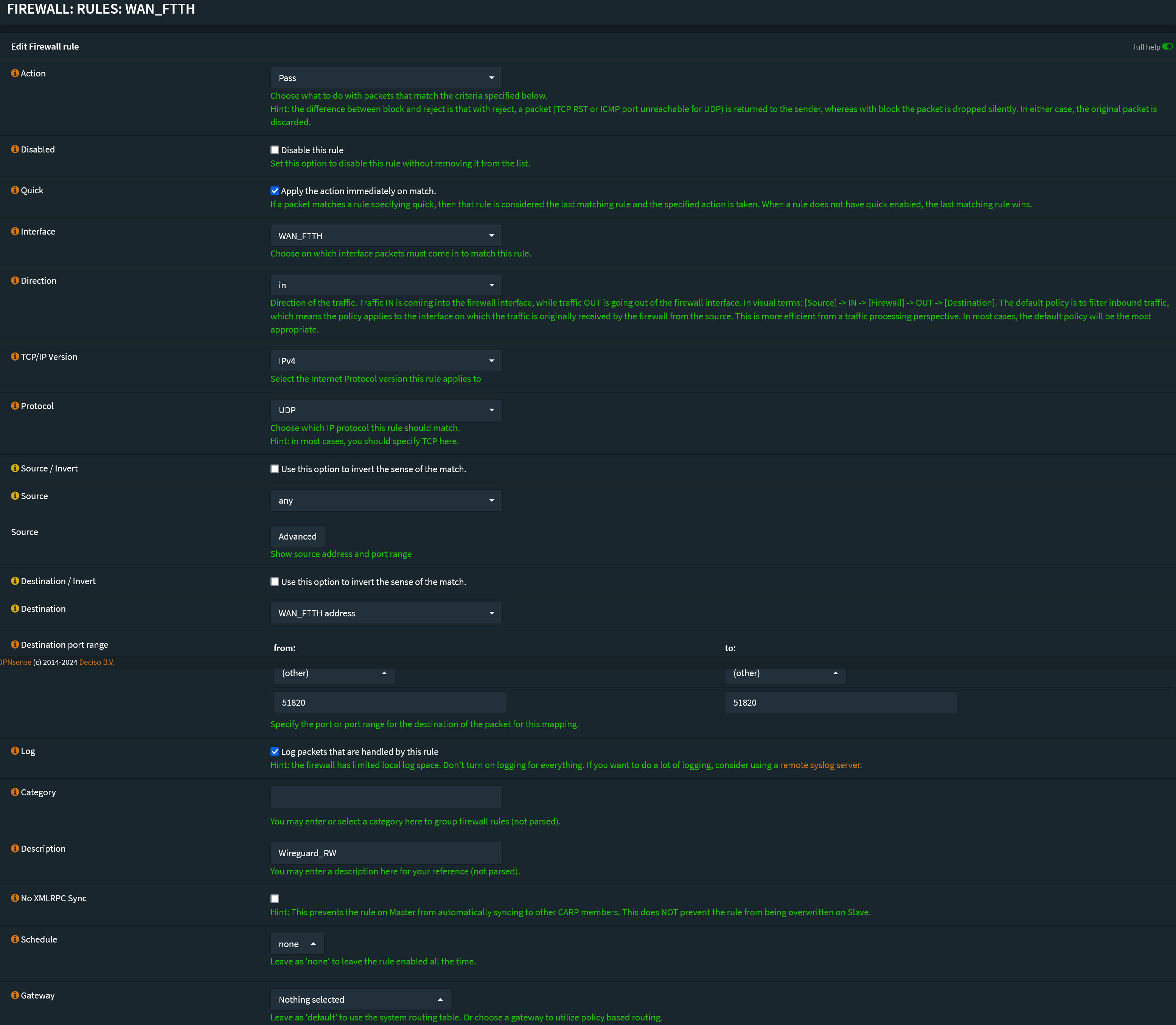 - Destinazione: qualsiasi, cambiare se volete restringere le destinazioni raggiungibili dai client WireGuard